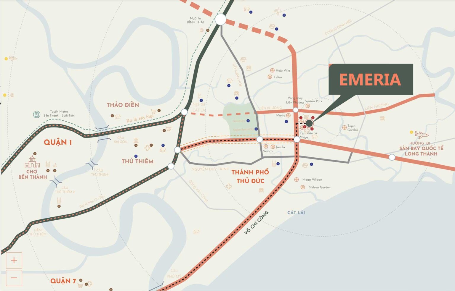 Ngoài ra, The Emeria Khang Điền Thủ Đức có vị trí gần khu đô thị mới Thủ Thiêm, chỉ cách trung tâm Quận 1 và Khu đô thị Phú Mỹ Hưng khoảng 10-15 phút đi xe, tạo điều kiện thuận lợi cho cư dân tiếp cận các tiện ích đa dạng và cao cấp. Với vị trí đắc địa này, việc di chuyển đến các thành phố du lịch nổi tiếng như Vũng Tàu, Phan Thiết, Đà Lạt cũng trở nên thuận tiện, mang đến cuộc sống tiện nghi và đẳng cấp cho cư dân tại Emeria.