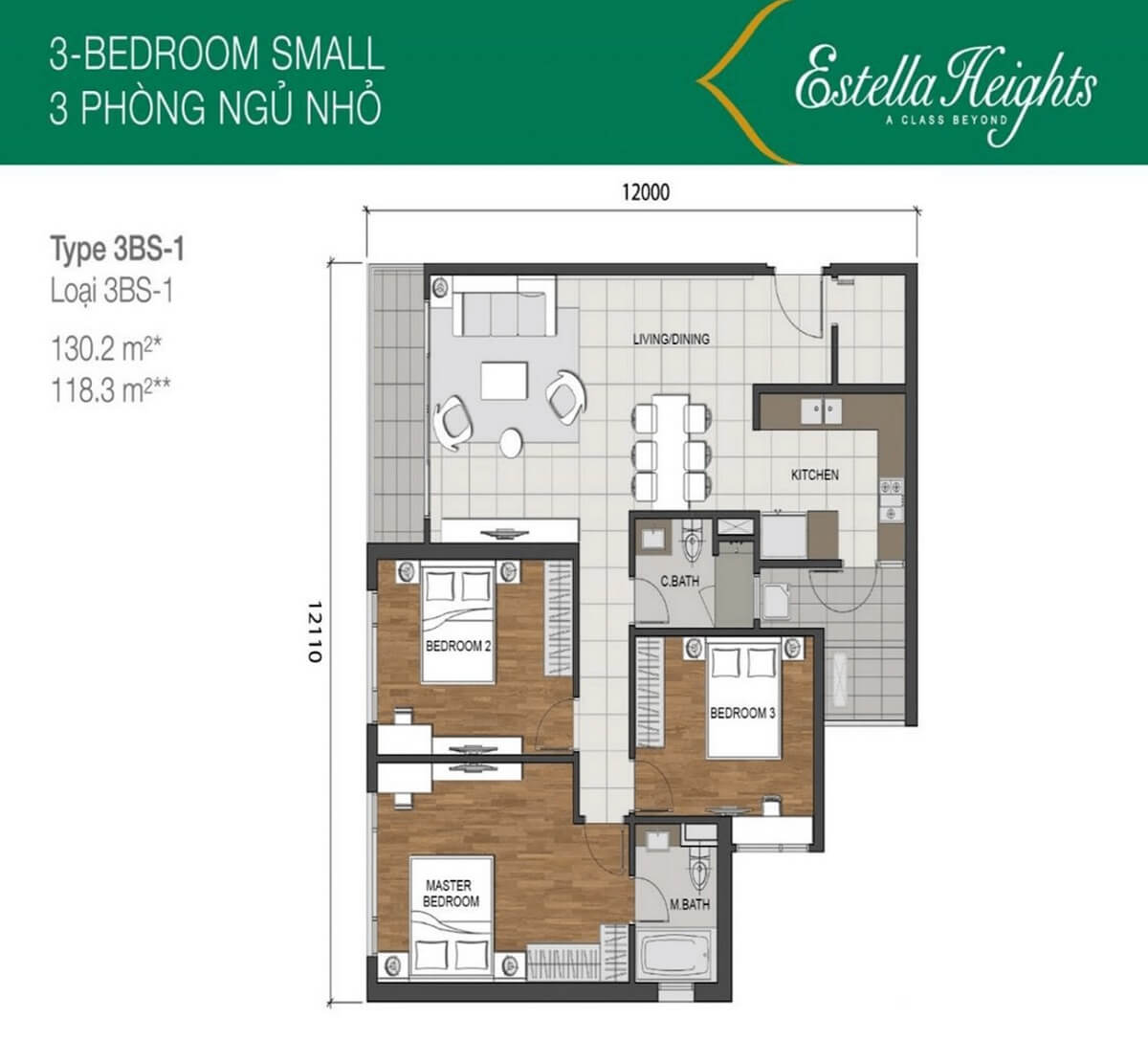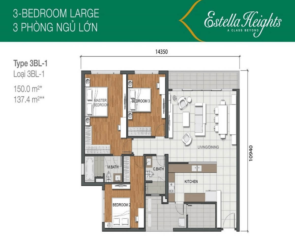 Các căn hộ 3 phòng ngủ tại Estella Heights bao gồm hai loại diện tích chính: 130m² và 150m². Tất cả các căn hộ 3 phòng ngủ đều nằm ở vị trí căn góc, đem lại nhiều ưu điểm về sự thông thoáng. Các căn hộ này có khu vực sinh hoạt chung rộng lớn, và các ban công rộng lớn có thể được tùy biến để tạo thành một khu vườn rau, góc cafe, hoặc góc uống trà… Phòng bếp được thiết kế thẩm mỹ, tuân theo nguyên tắc phong thủy, và bếp cũng được liên kết trực tiếp với khu vực sân phơi quần áo, giúp giảm thiểu mùi khi nấu ăn và đảm bảo sự thông thoáng cho toàn bộ căn hộ.