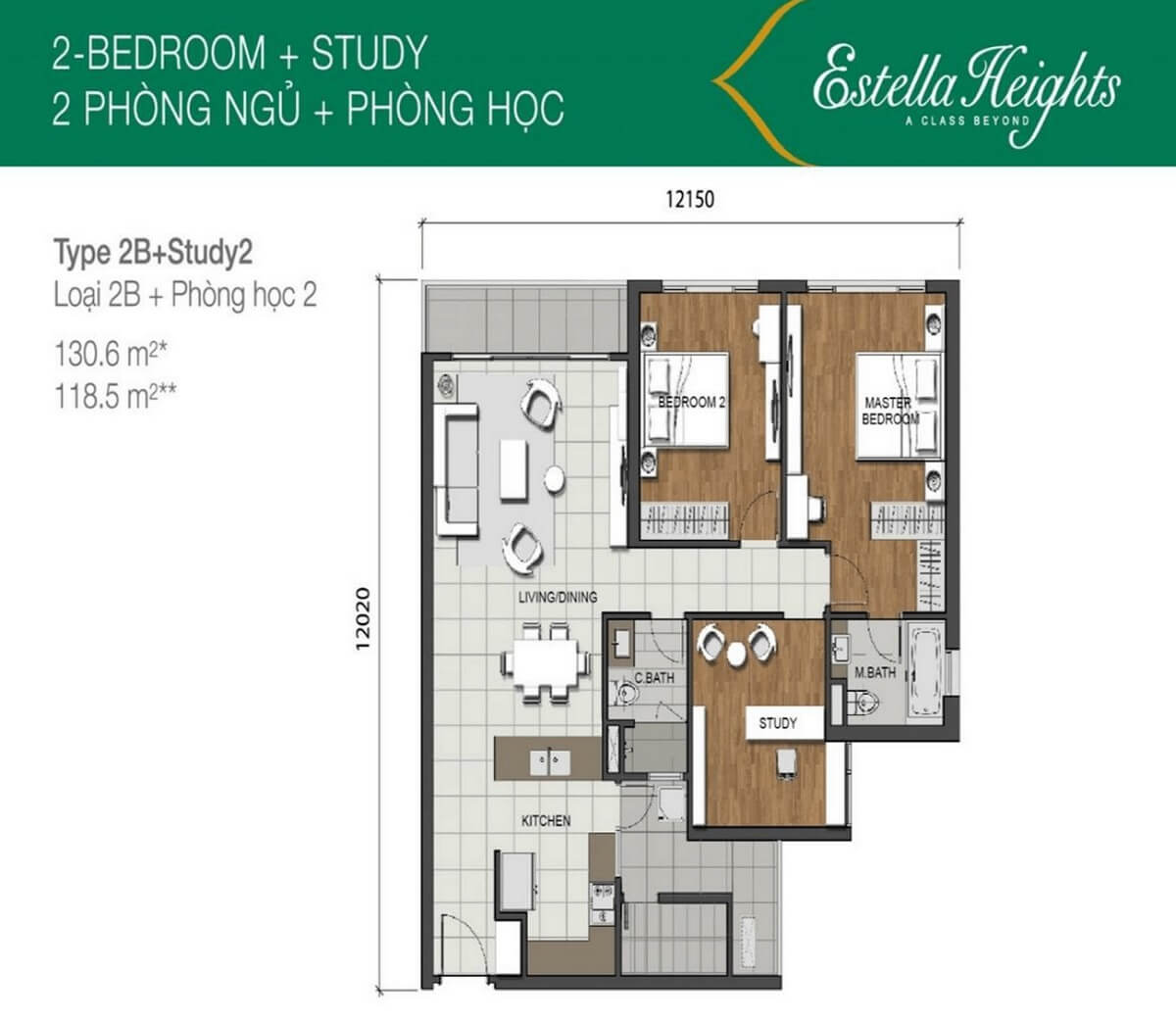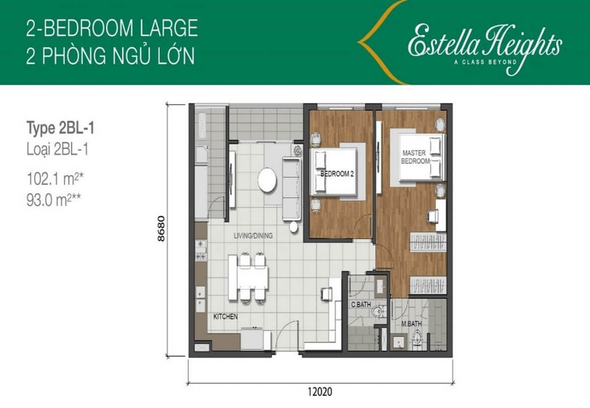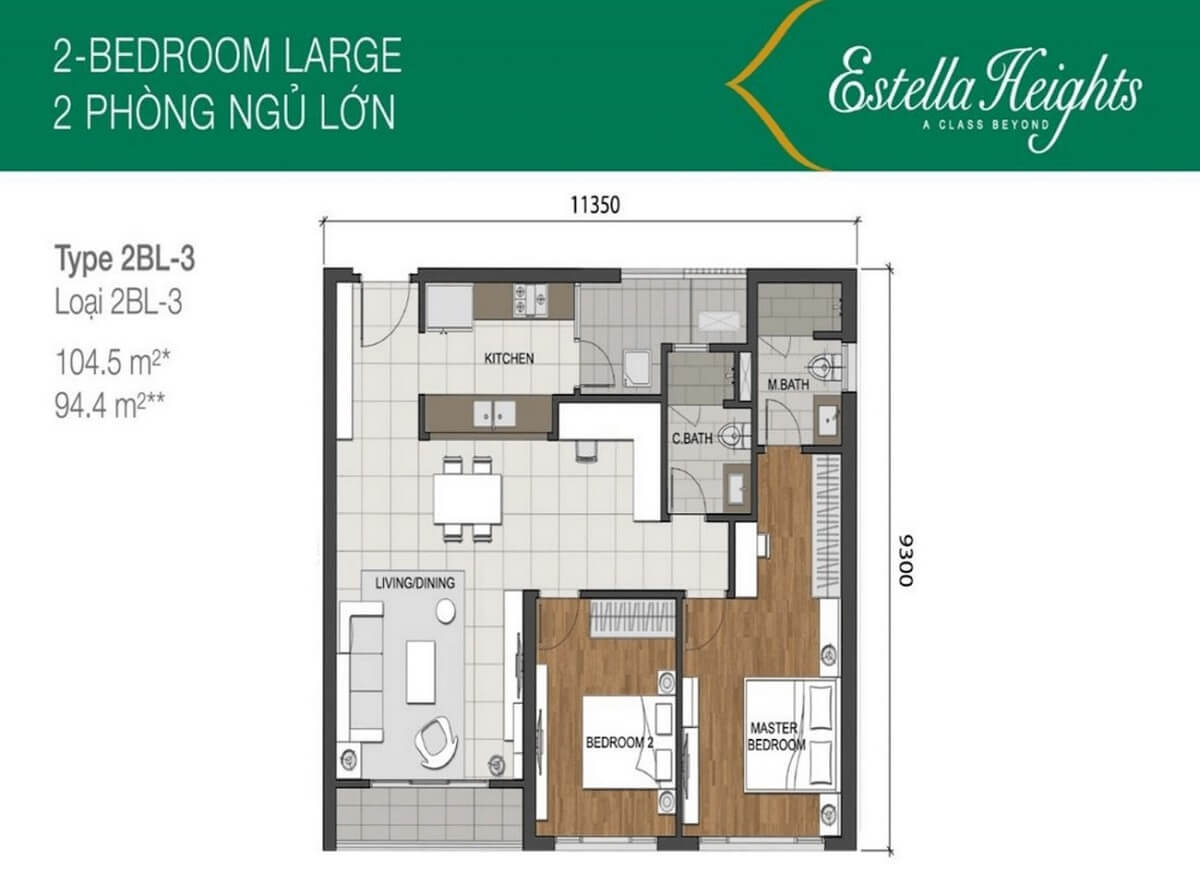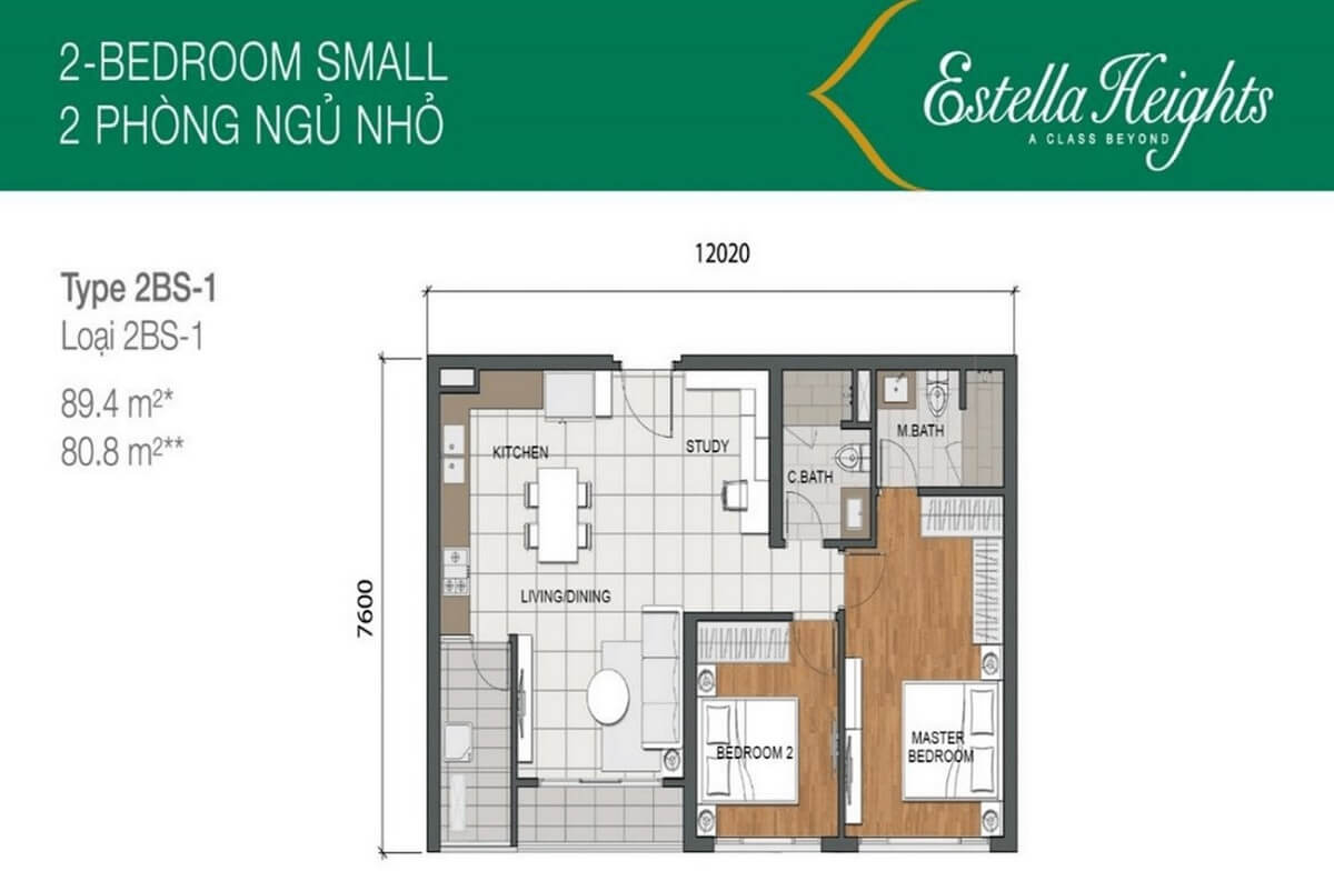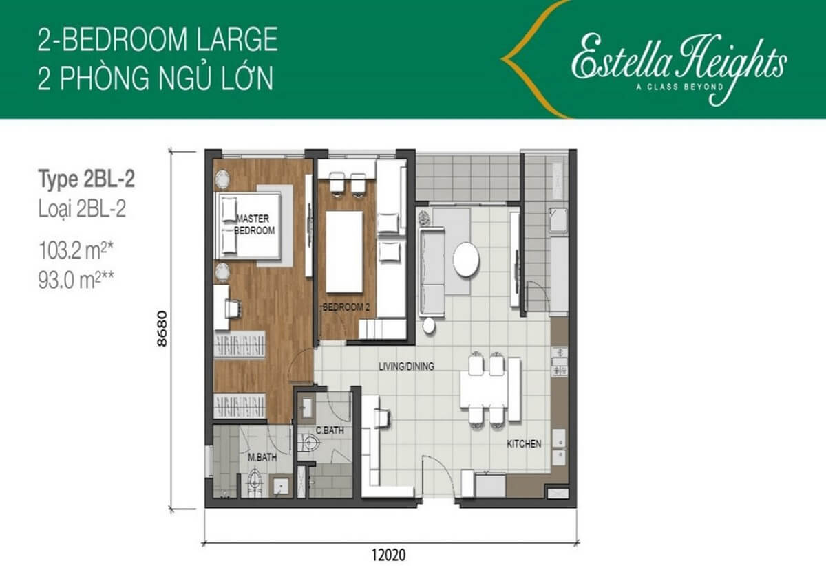 Các căn hộ 2 phòng ngủ tại Estella Heights bao gồm 4 loại diện tích chính, chia thành 2 loại cơ bản: căn hộ 2 phòng ngủ nhỏ và căn hộ 2 phòng ngủ lớn. Các căn hộ 2 phòng ngủ nhỏ có diện tích 89.4m². Các căn hộ 2 phòng ngủ lớn có 3 loại diện tích: 102.1m², 103.2m² và 104.5m². Các căn hộ 2 phòng ngủ được thiết kế với cả hai phòng ngủ đều có view thoáng, và chúng được liên kết trực tiếp với logia rộng rãi. Bếp được thiết kế mở và hiện đại, liên kết trực tiếp với sân phơi quần áo và phòng giặt.