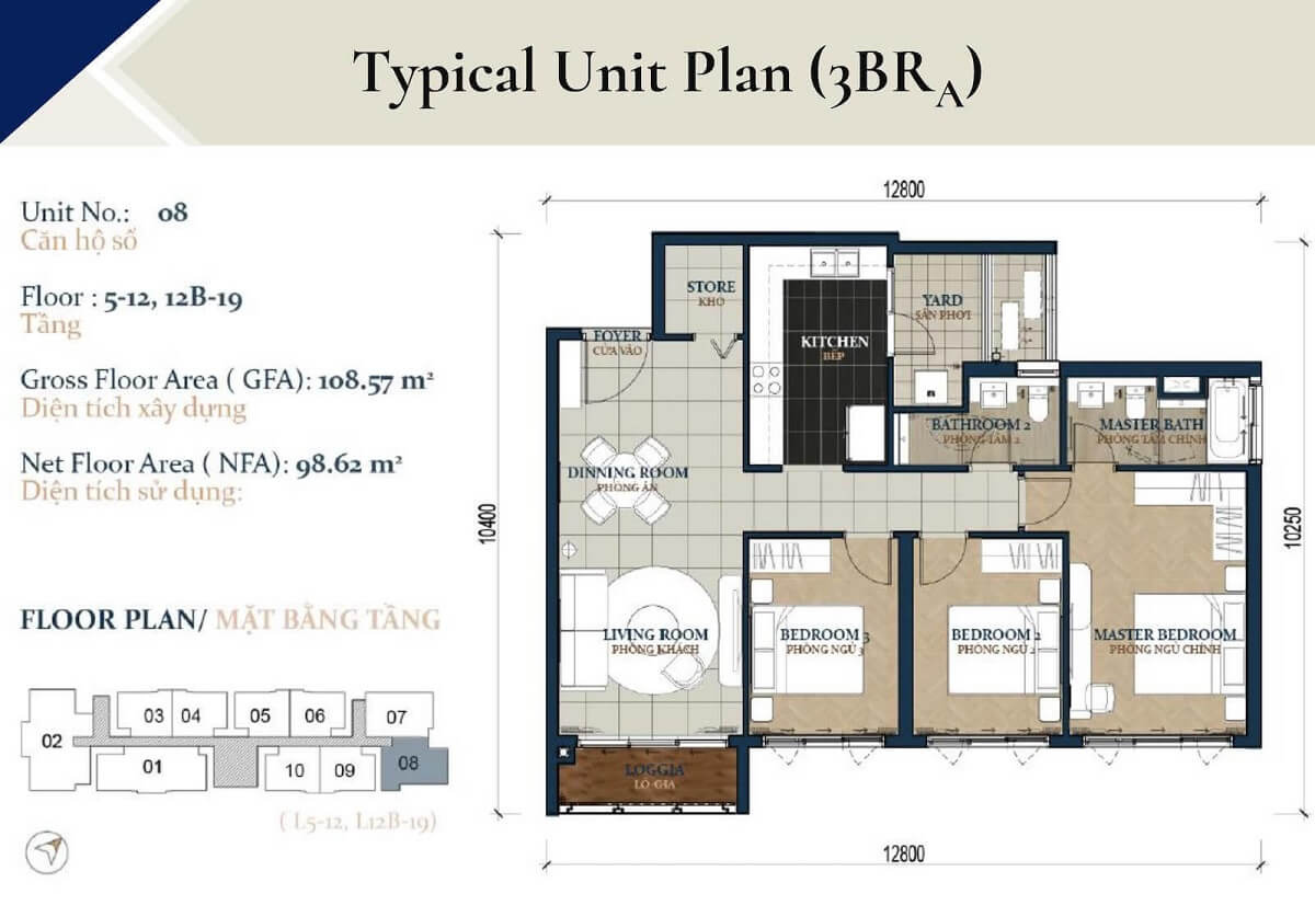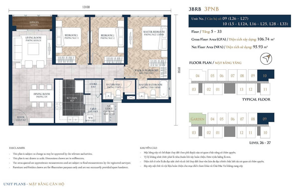 3 phòng ngủ (95.56–109 m²): 8–10.2 tỷ VND.