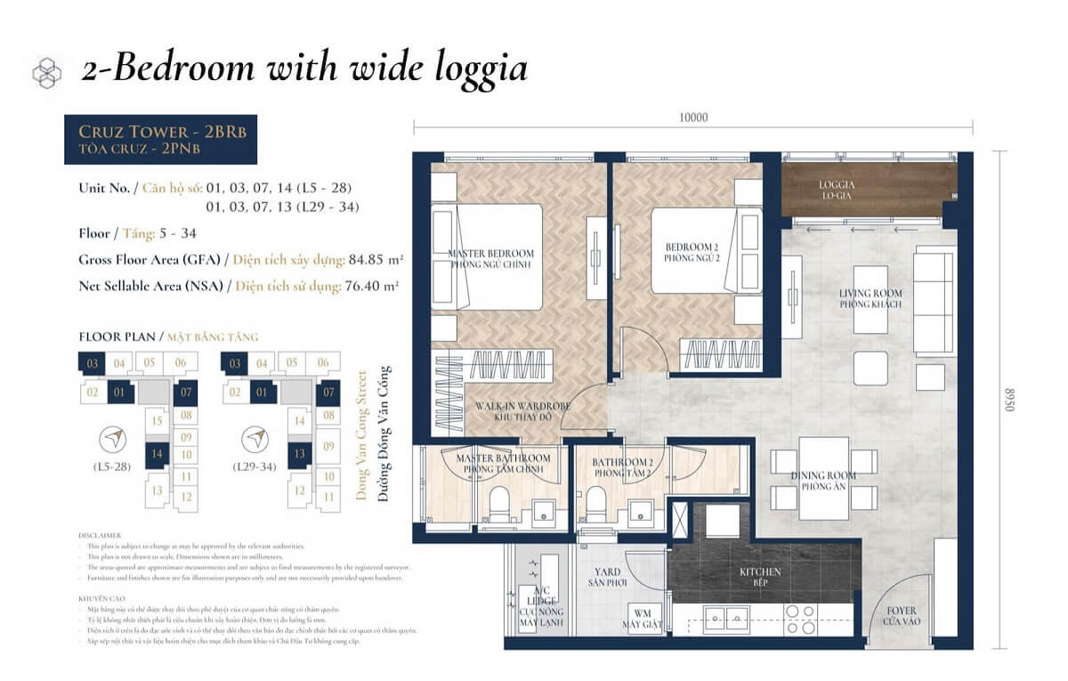 2 phòng ngủ (76–103 m²): 5.6–9.7 tỷ VND.