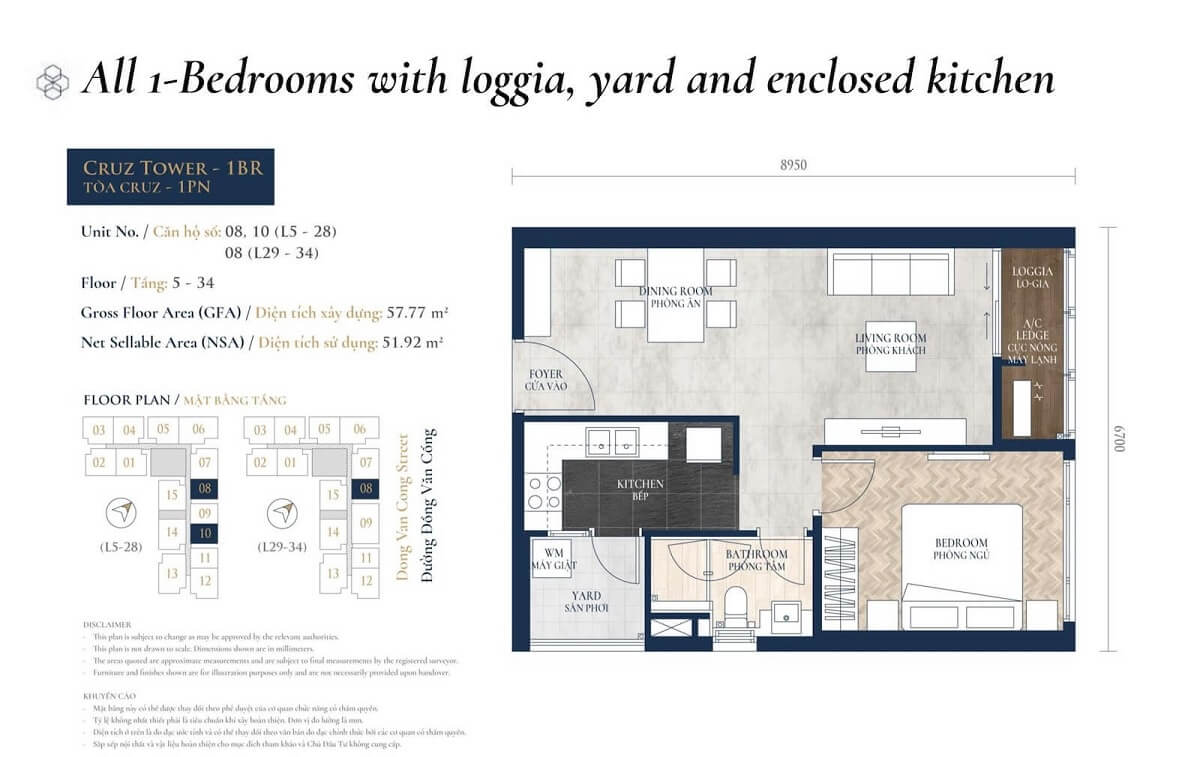 1 phòng ngủ (51.92–58 m²): 4–5.2 tỷ VND.