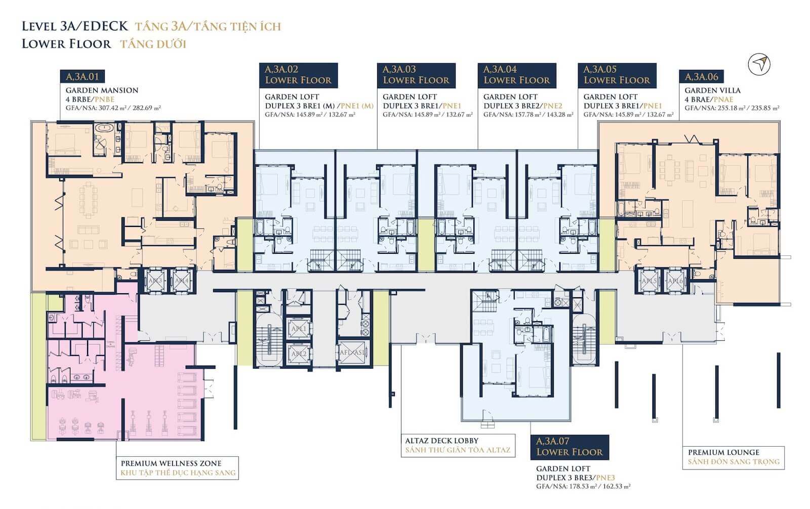 Feliz en Vista nổi bật với hơn 100 tiện ích nội khu, được thiết kế theo tiêu chuẩn resort 5 sao, trải rộng trên 3 khu vực (tầng trệt, tầng 3-3A, và tầng vườn trên không):