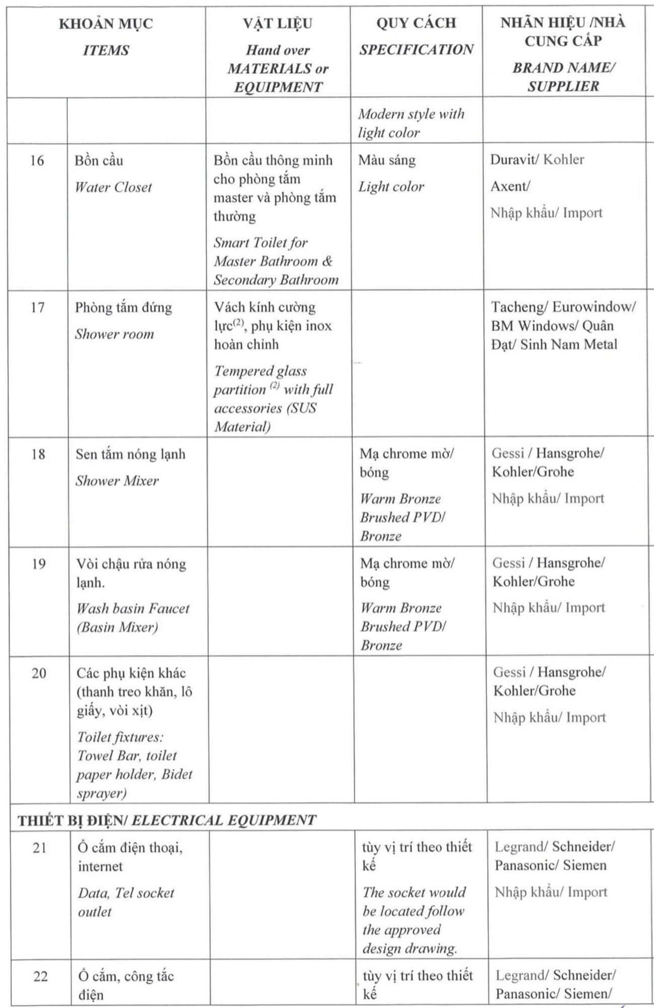 Các căn hộ tại Grand Marina Saigon Quận 1 được trang bị nội thất và trang thiết bị theo tiêu chuẩn cao cấp, nhằm mang đến trải nghiệm tối ưu cho cư dân. Sự hợp tác giữa tập đoàn Masterise Homes & Marriott International và các thương hiệu nội thất hàng đầu thế giới như Legrand, Hafele, Kohler đã đem lại những sản phẩm chất lượng cao nhất.