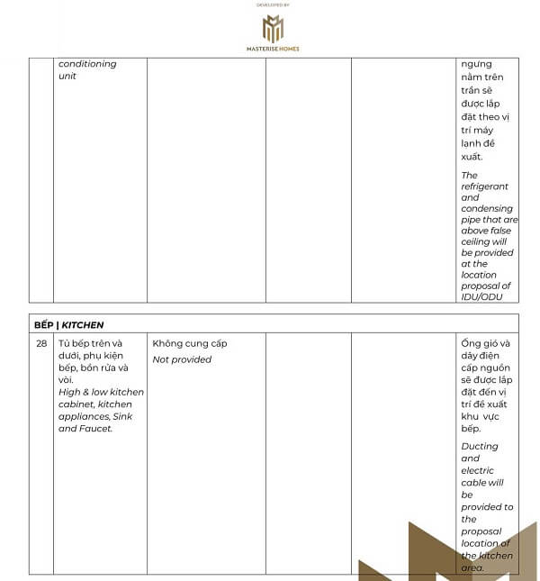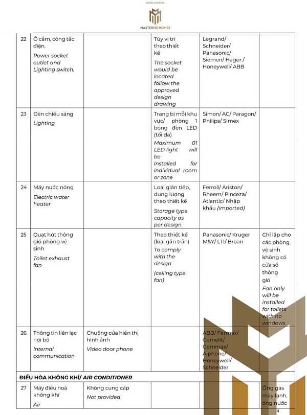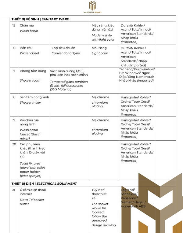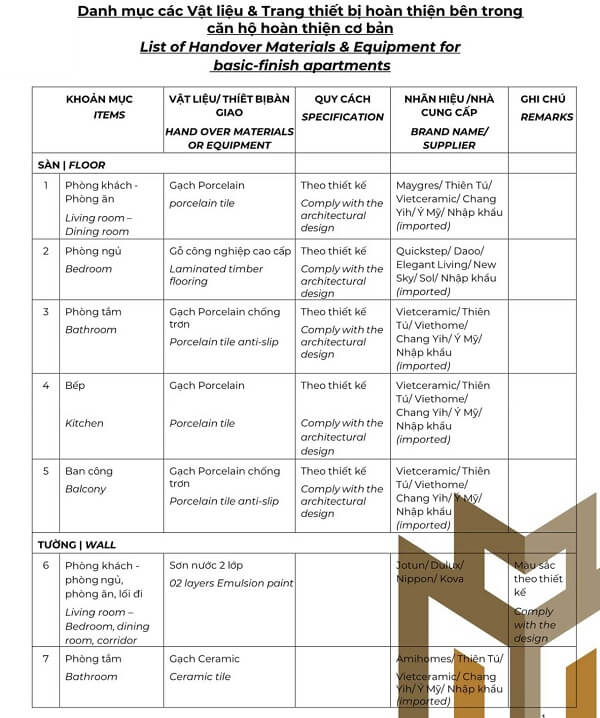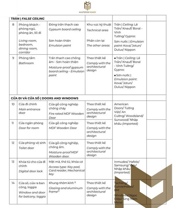 Danh sách các vật liệu bàn giao trong các căn hộ tại Lumiere Boulevard Masterise bao gồm: