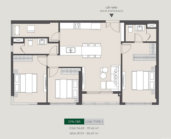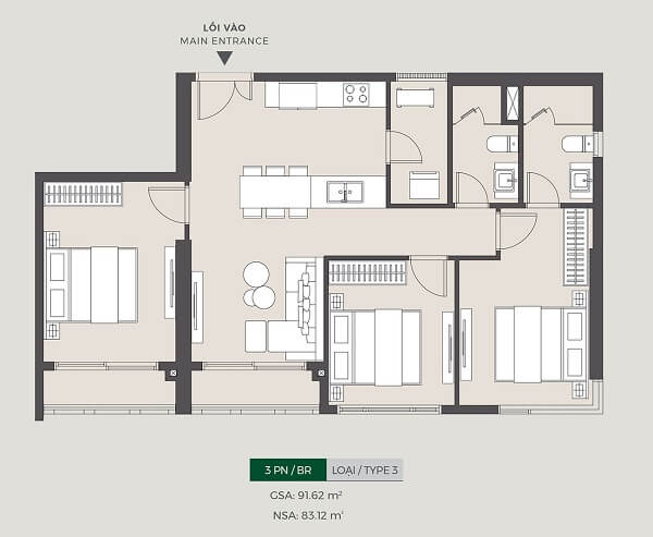 Các căn hộ 3 phòng ngủ tại Lumiere Boulevard được đặt tại vị trí góc tầng, mang lại lợi thế về khả năng thoáng mát từ nhiều hướng khác nhau. Tận dụng điều này, chủ đầu tư đã bố trí các phòng ngủ với cửa sổ lớn hướng ra ngoài, đảm bảo sự thông thoáng cho từng phòng ngủ và cả căn hộ. Phòng khách được thiết kế để kết hợp với không gian bếp và khu vực ăn, tạo ra một không gian sống chung cho toàn gia đình. Các căn hộ cũng có khu vực ban công và sân phơi riêng biệt, đảm bảo tính thẩm mĩ và lưu thông không khí, mang lại sự thoáng đãng cho toàn bộ căn hộ.