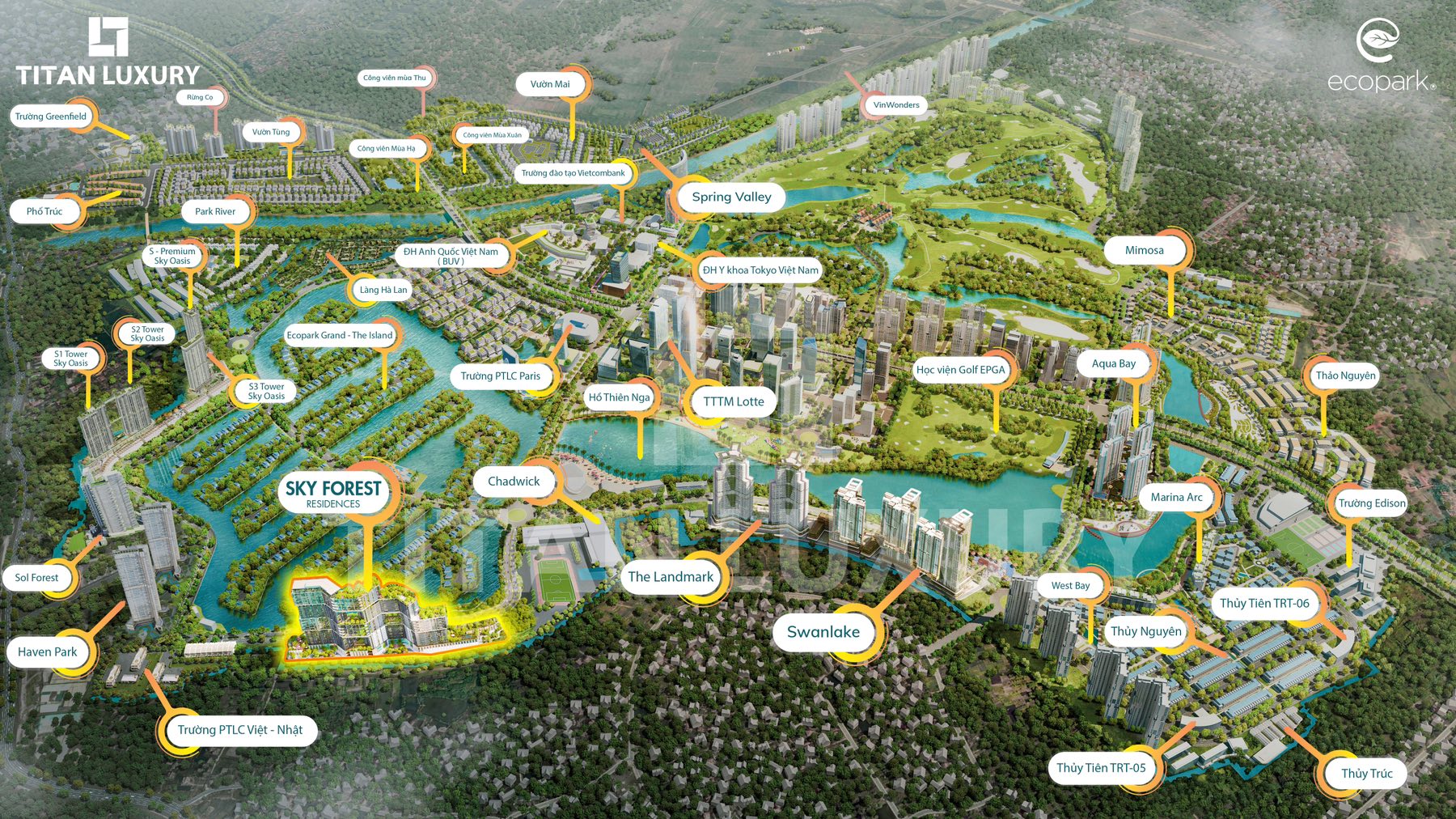 Sky Forest bao gồm 3 khối toà: Toà SF1 với 30 tầng, toà SF2 với 38 tầng và toà SF3 với 41 tầng. Thiên nhiên không chỉ giới hạn trong đại công viên xanh lớn nhất Việt Nam, những căn nhà không chỉ là một phần của vườn, mà vườn còn hòa mình giữa không gian công viên. Với dự án Sky Forest, Ecopark đưa thiên nhiên lên một tầm cao mới, với 8 công viên quy mô 10.000 m2 giữa bầu trời, kèm theo gần 1.000 sân vườn nằm giữa các tầng không.