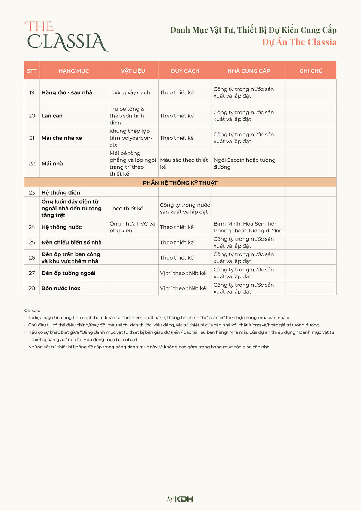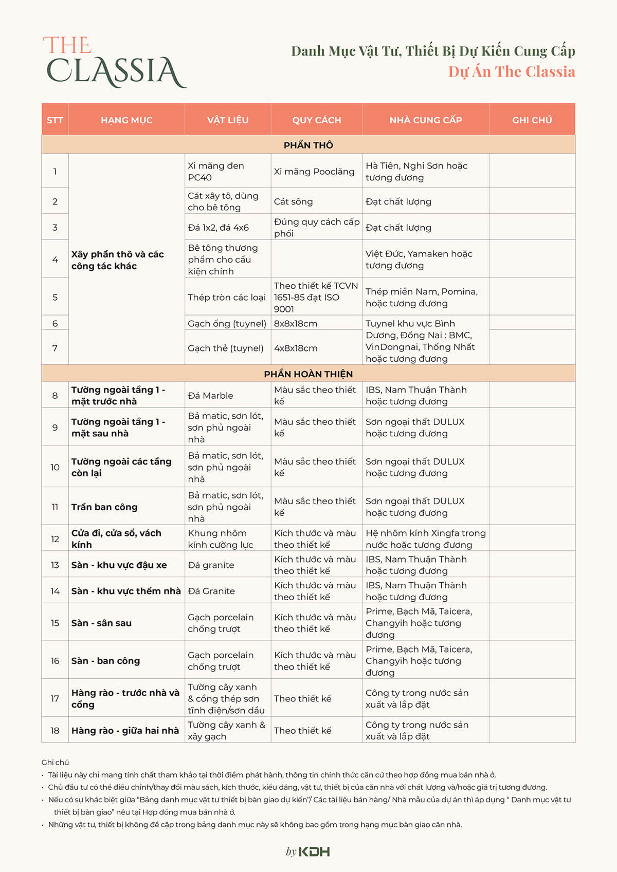 DANH MỤC VẬT LIỆU BÀN GIAO DỰ ÁN NHÀ PHỐ THE CLASSIA QUẬN 9