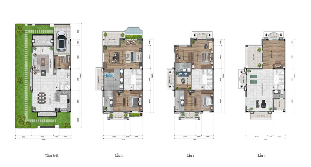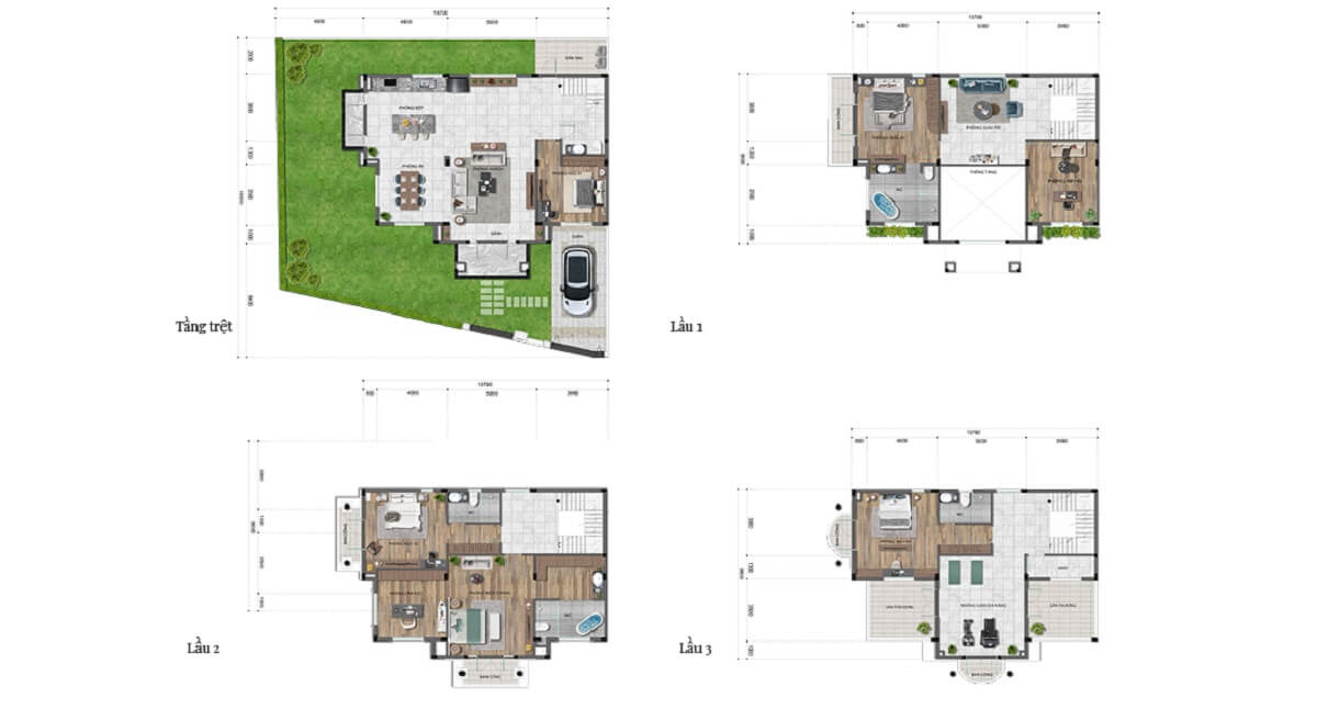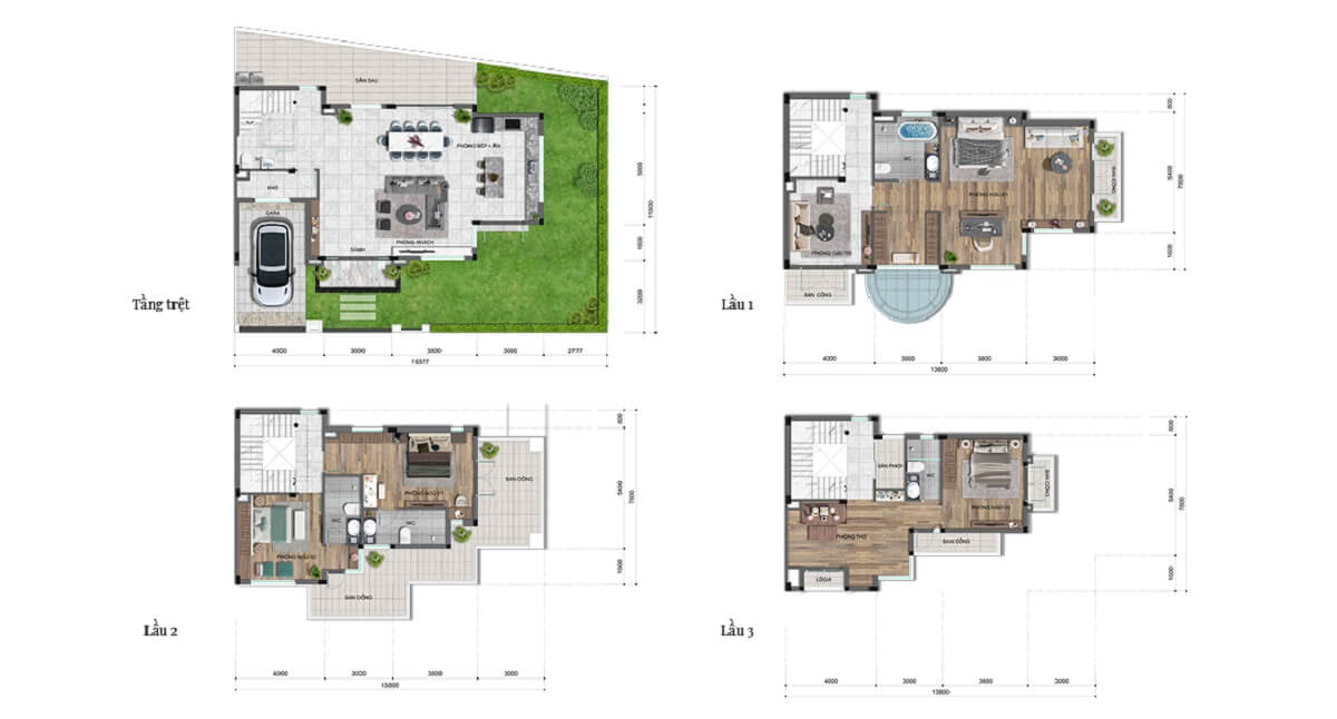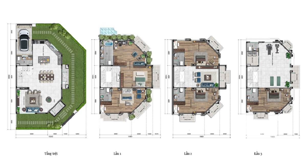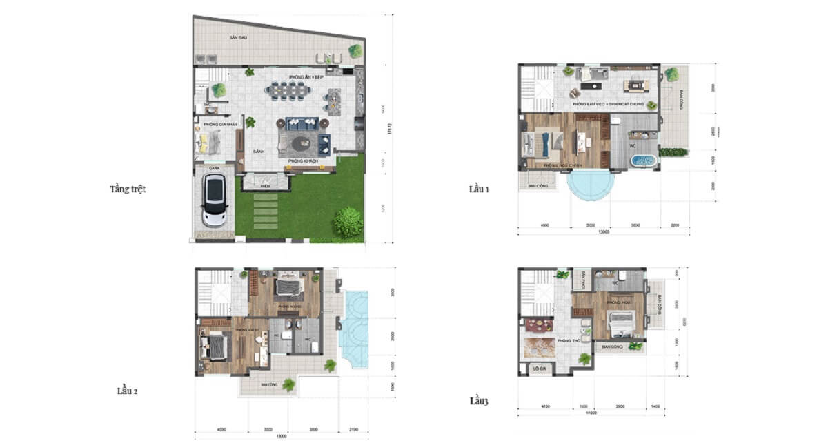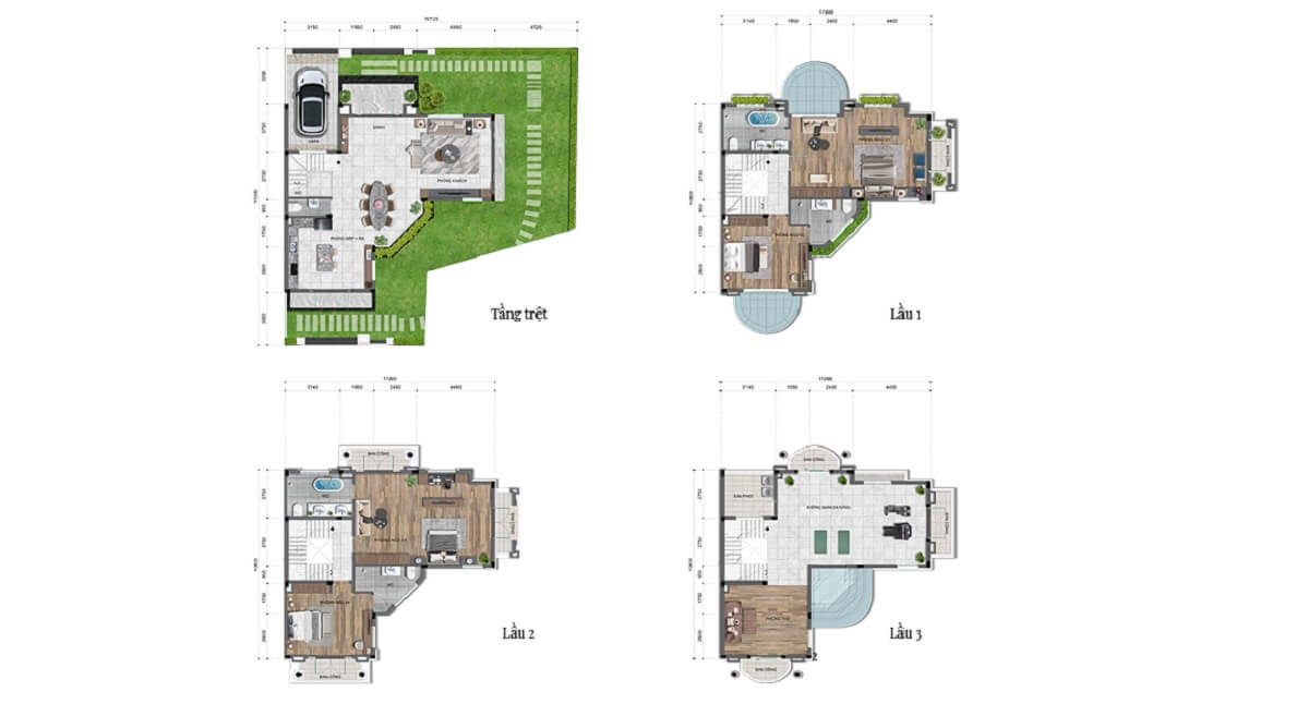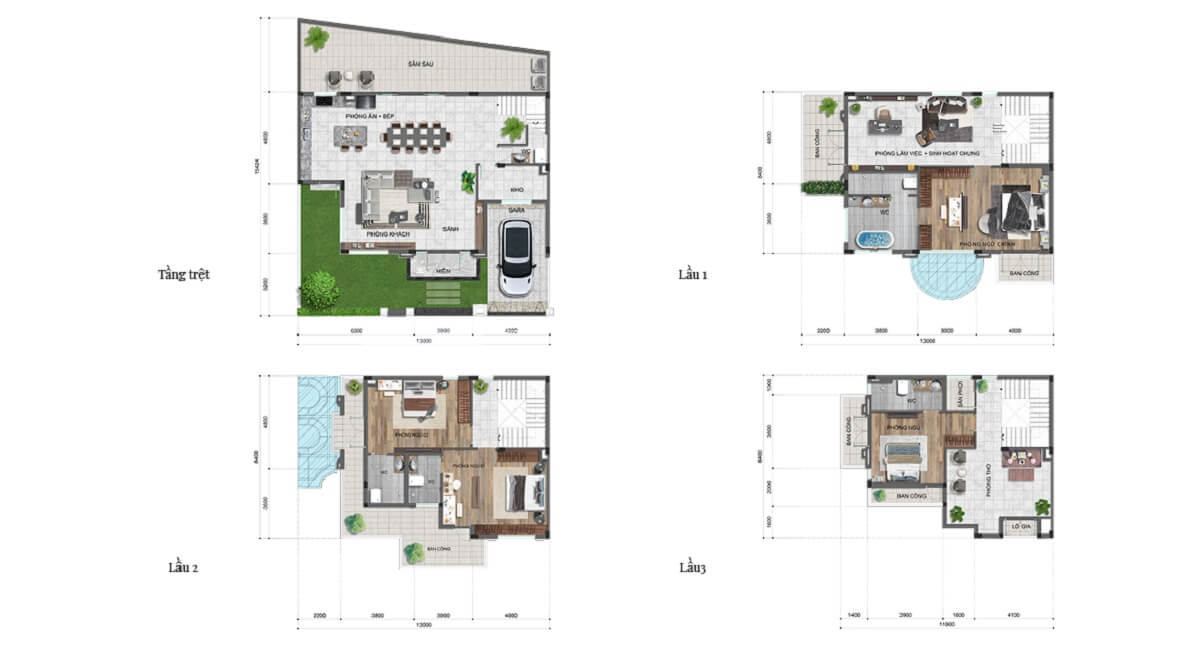 - Biệt thự: Từ 155.3m² đến 239.9m².
