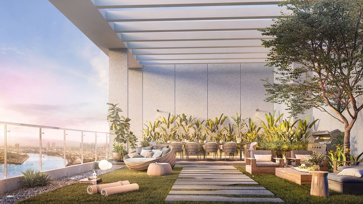 The River Thu Thiem không chỉ tập trung vào việc xây dựng các khu căn hộ mà còn chú trọng đến mảng xanh xuyên suốt dự án, tạo nên một không gian sống như trong các khu nghỉ dưỡng cao cấp. Các hành lang và khu vực chung được thiết kế với nhiều cây xanh, cùng với các yếu tố nước như đài phun nước và hồ bơi, mang đến một không gian thư giãn và gần gũi với thiên nhiên.